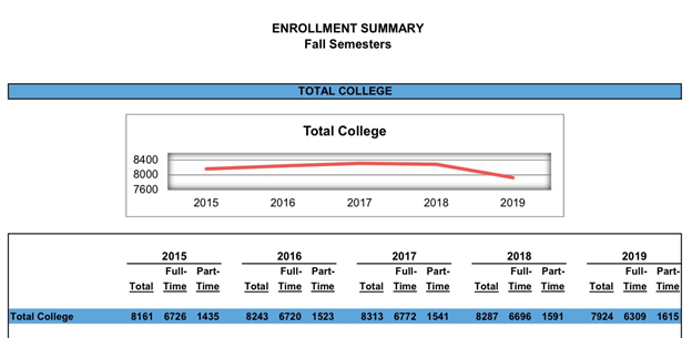 The enrollment of a college is bound to go through ups and downs. Over a five year span, The College At Brockport saw these effects. Between the years of 2015 and 2019 enrollment dropped from 8,161 students to 7,924. Meaning over the course of these five years the school has lost roughly 237 students. These numbers can be impacted both by enrollment itself and by the retention of students as some may level the college before graduating.